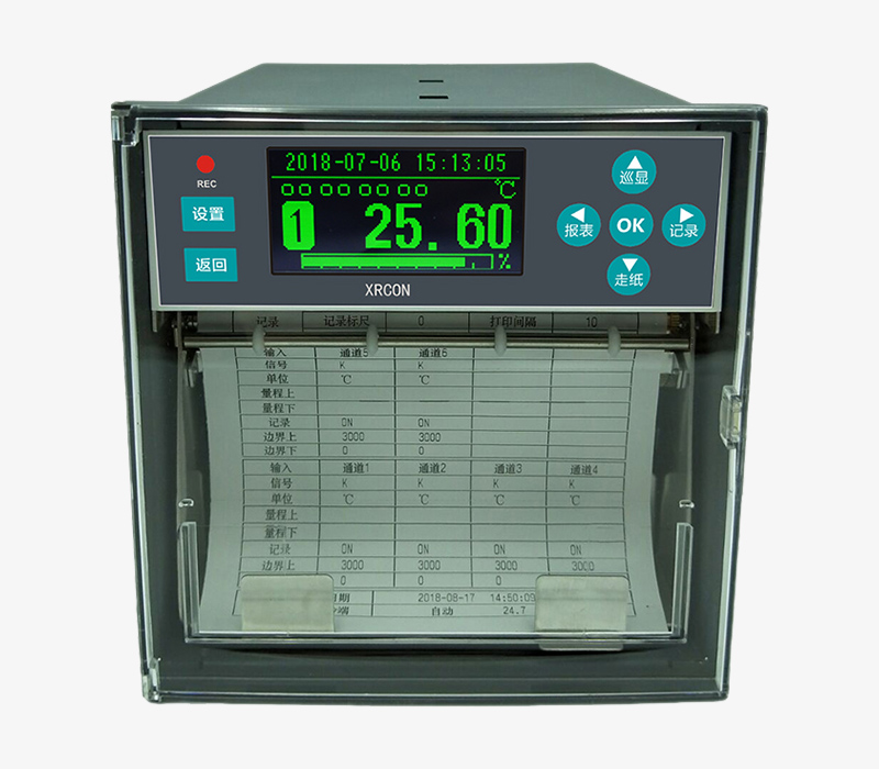 CHR12R系列有紙記錄儀畫面信息豐富,可同時顯示時間、數據、棒圖、報警等,支持定點和循環顯示,最多12通道萬能輸入,可輸入電流、電壓、熱電偶和熱電阻等多種輸入信號。